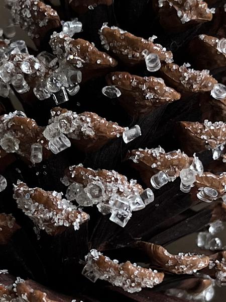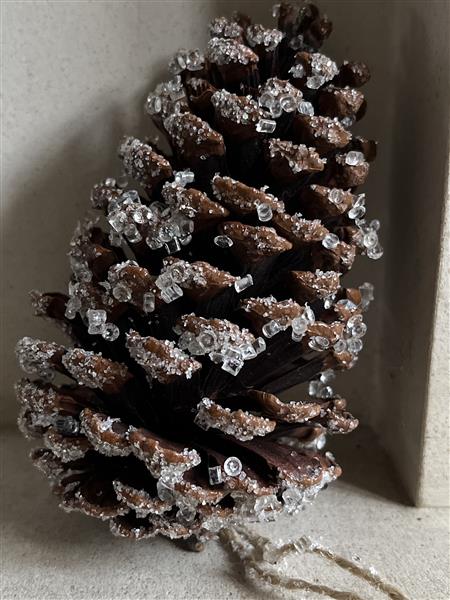 Real natural giant pine cone with artificial crystalized ice and froze accents creating a luxury look whether its to hang onto a tree place within a garland or a accent to your desired location, this pine cone really finishes off the look.