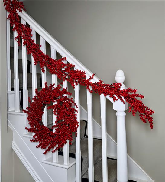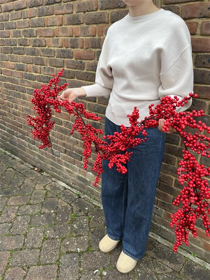 Add luxurious festive style with this full red berry Christmas garland. Expertly handcrafted from wicker, metal wire and artificial berries, it’s realistic, long-lasting, and easy to shape.
