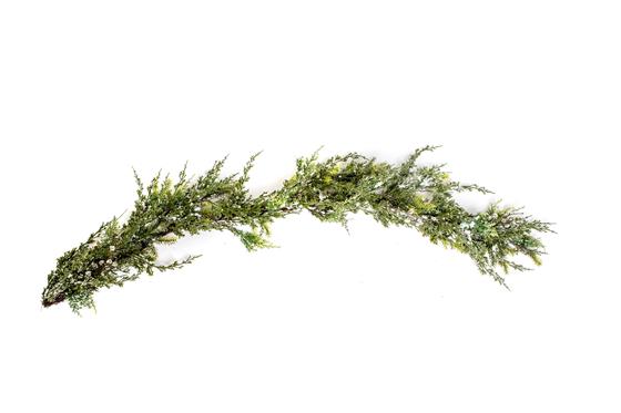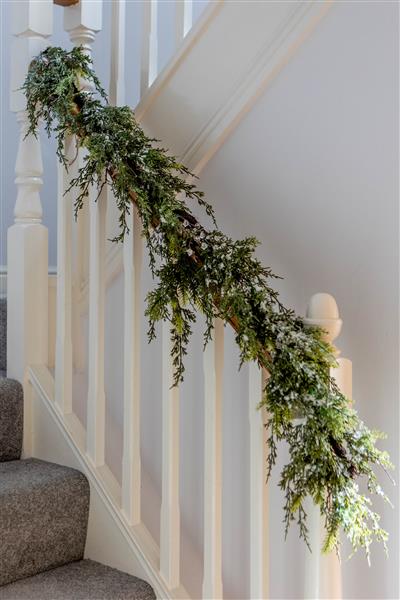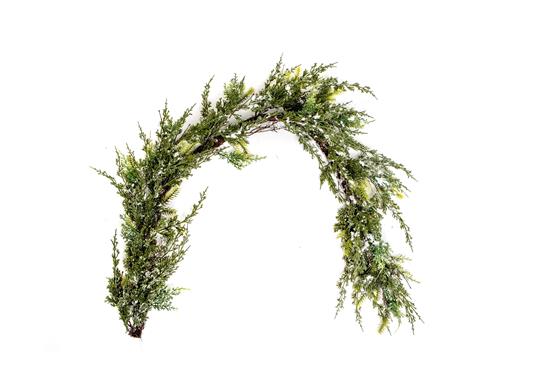 A thick and full faux garland created using faux snowy, frosted and crystalised pine.