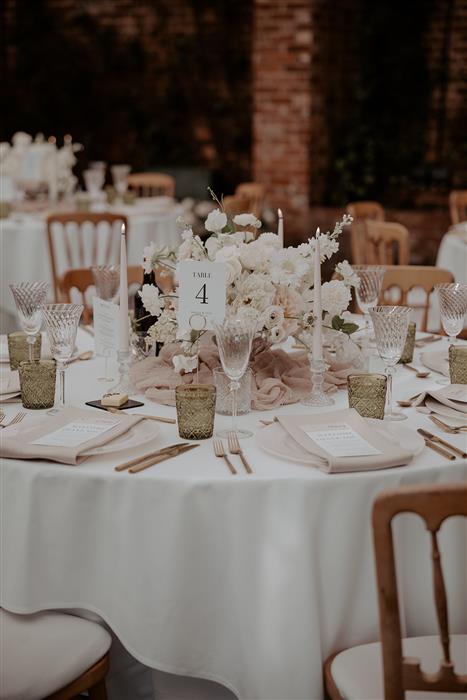 For their centrepieces, they chose our classic ivory and cream Wild Flower Garden collection, placed on a mixture of tall slim glass vases and in low glass-footed vases. Accompanying the centrepieces, we styled their tables with glass notices and tapered ivory candles to add a romantic glow.
