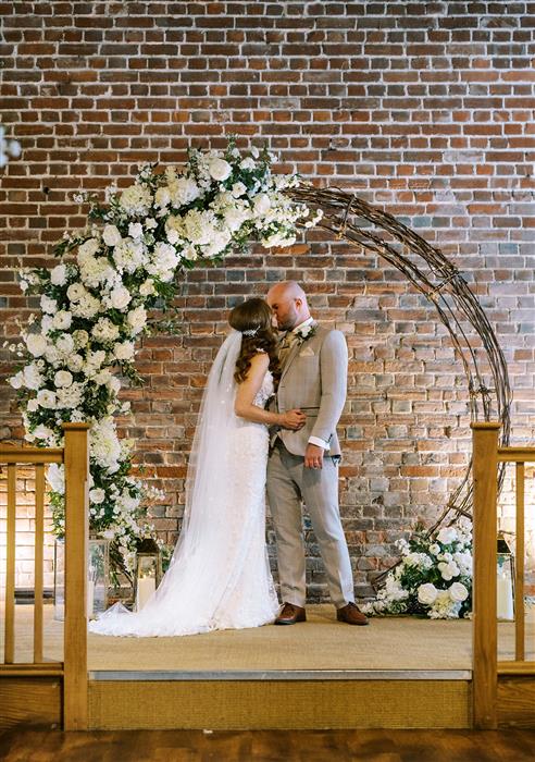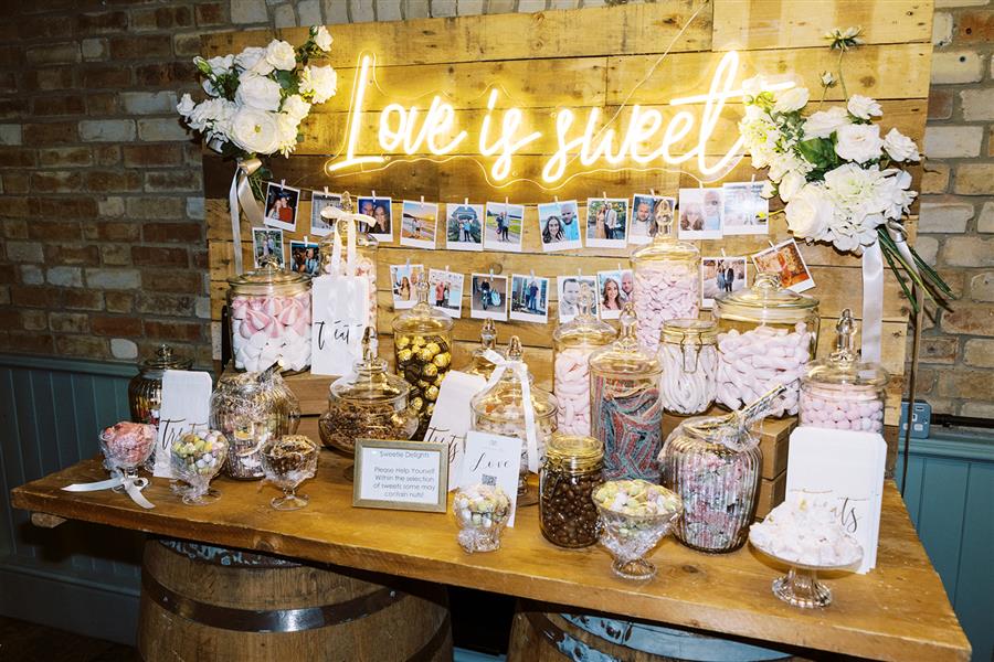 For the ceremony, four of the tall arrangements were placed on plinths to line the aisle and our giant wicker moon gate was decorated to provide a beautiful backdrop as they said their vows. This was then moved to behind their sweetheart top table for during the wedding breakfast. Our rustic sweetie table on wooden barrels below our 'Love Is Sweet' neon sign then offered some fun for the evening!