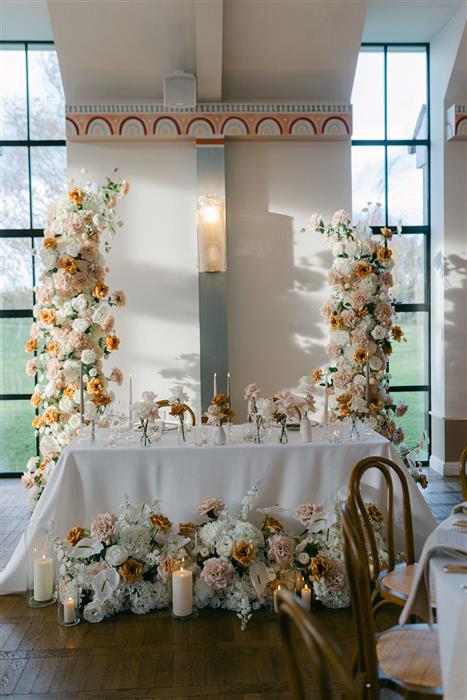 The pair selected our Caramel Latte collection, featuring ivory and nude tones mixed with toffee, rust and dusky apricot. Their spectacular ceremony saw a magnificent 9ft floral broken arch take centre stage, with a romantic meadow and candle aisle lining the Bride's entrance.