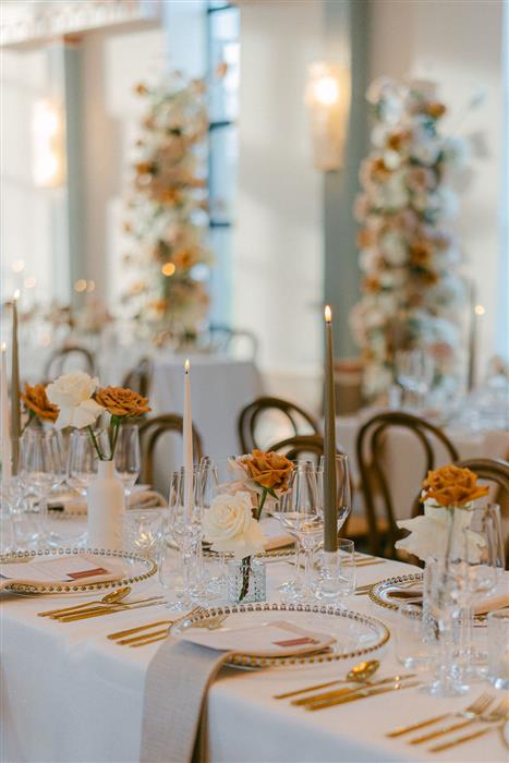 For the wedding breakfast, their long tables were decorated with glass and ceramic bud vases filled with reflexed roses, whilst their round table centrepieces were ceramic bowls with a modern arrangement of luxury faux flowers.